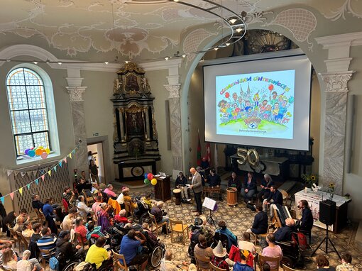 In Rathausen startet unsere Jubiläumswoche – «ein himmlischer Start» mit Musik der «SSBL Musigbänd», einem «Blick ins Fotoalbum», mit 50 fliegenden Tauben, Geburtstagsdrinks, Ballonen und jeder Menge Kuchen. Aber vor allem: Wir haben einzigartig wundervolle Mitfeiernde! Denn die Behindertenseelsorge feiert nicht sich selbst, sondern die Menschen, mit denen wir unterwegs sind!